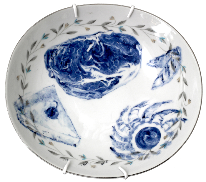 Steak, shrimp, chicken strips, salad, and a slice of cheesecake.