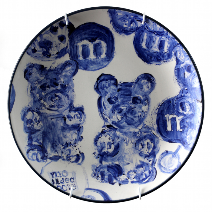 Meat pizza, gummy bears, M&Ms, and orange juice.