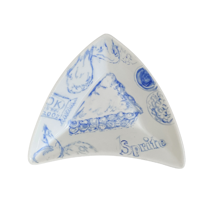Fried chicken, a package of hard cheddar cheese, barbecue sauce, cottage cheese, slice of cherry pie, and a two-liter bottle of Sprite.