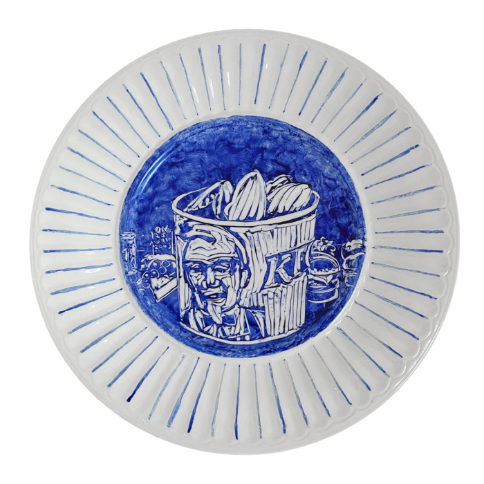Three chicken breasts and three chicken wings from KFC, broccoli spears with cheese sauce, a baked potato with sour cream and chives, two bacon cheeseburgers, two slices of cherry cheesecake and two 7-Ups.