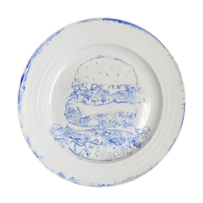 Triple meat cheeseburger with fried bun and everything, French fries, ketchup, four pieces of chicken (two legs and two thighs), and one fried pork chop sandwich.