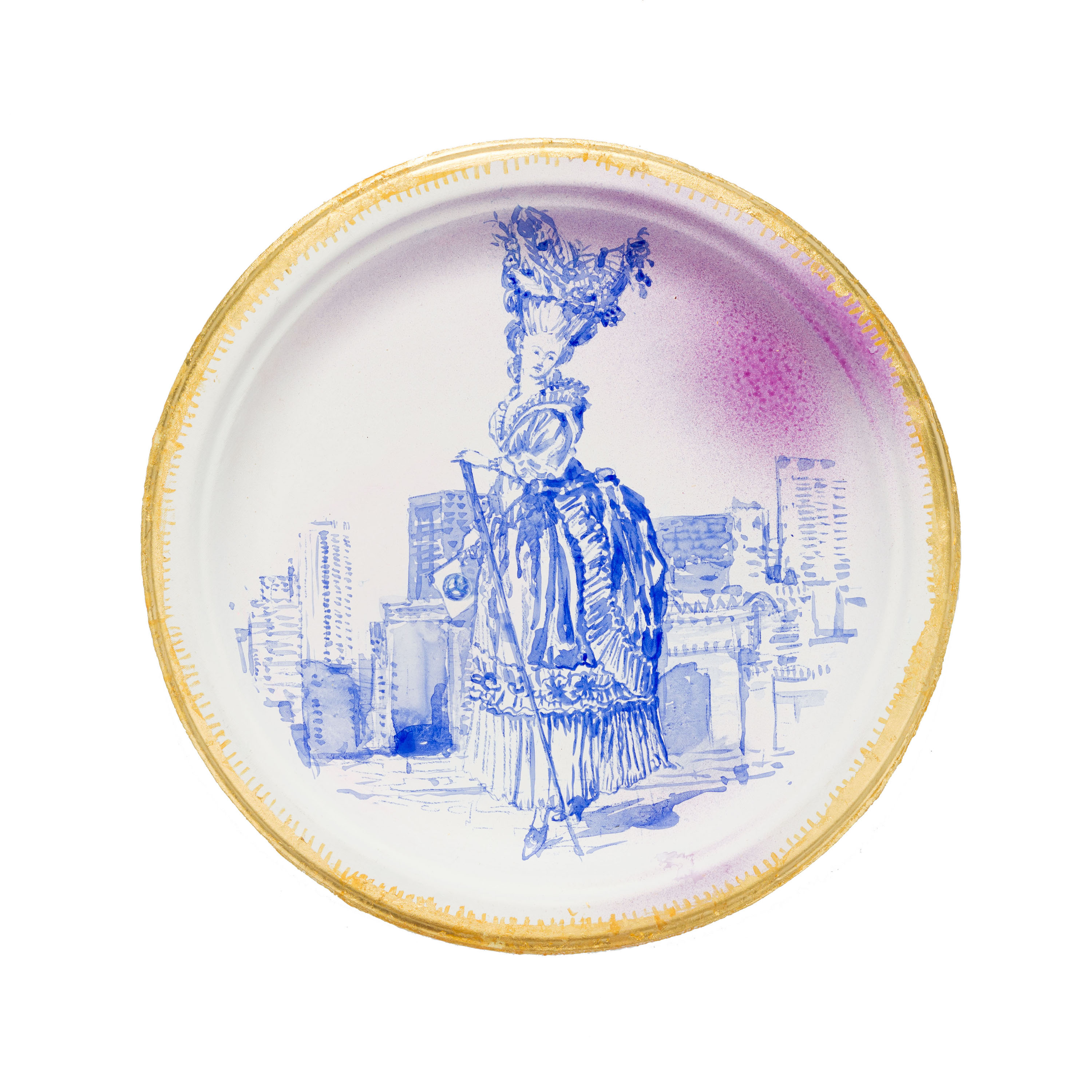 acrylic, glow-in-the-dark paint and 22K gold leaf on gessoed Chinet plate